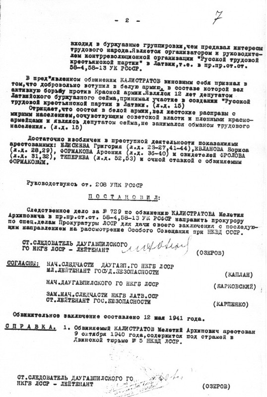 Только 12 мая 1941 года было принято "Обвинительное заключение". Из указанного документа видно, что М.А. Каллистратов признал себя "виновным в том, что добровольно вступил в белую армию, а в последствии в течение 12 лет был депутатом Сейма и принимал участие в создании "Русской трудовой крестьянской партии". Но чекистам не удалось заставить его признать свою вину, что находясь на службе в белой армии, он участвовал в расправах над мирным населением и пленными красноармейцами. Отверг он и нелепое обвинение, что будучи депутатом Сейма, занимался "обманом трудового народа".