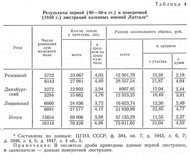 Чрезмерная эксплуатация крестьян, обременение их высокими налоговыми платежами, обнищание крестьянской деревни, падение ее платежеспособности и, наконец, крестьянские выступления, которые имели место в конце XVIII — начале XIX в., — все это говорило о том, что феодально-крепостническая система в первой половине XIX в. переживала глубокий кризис. Чтобы преодолеть его, царское правительство решилось на проведение реформы, вначале касавшейся только государственной деревни и предусматривавшей облегчение феодальной эксплуатации ее крестьян и повышение тем самым их платежеспособности. Эта реформа, проводившаяся в 30—50-е гг. XIX в. и известная как реформа П. Д. Киселева, предусматривала уничтожение арендной системы казенных имений и перераспределение земель с целью расширения крестьянского землепользования, а также ликвидацию барщины и перевод крестьян на денежный оброк. Не вдаваясь в подробности осуществления реформы, отметим только, что новое хозяйственное устройство государственных крестьян Западного края началось с проведения в 1839—1857 гг. люстрации государственных имуществ (53). В ходе ее была произведена прирезка земли, что в целом несколько улучшило обеспеченность землей государственных крестьян Латгале. Согласно новым постановлениям, каждому крестьянскому двору отводилось от 12,5 до 22,5 дес. земли (в зависимости от ее качества). При наделении землей обязательно учитывалась, как и ранее, обеспеченность крестьян рабочим скотом.