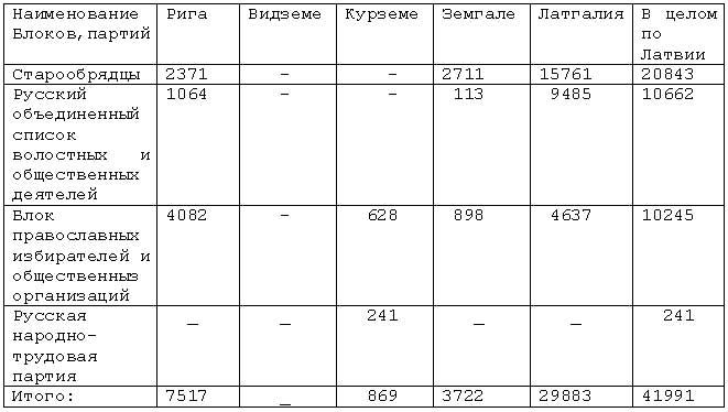 Несмотря на определенные успехи, итоги выборов заставляли призадуматься русских политиков. Опять значительная часть русских избирателей не пришла на выборы или же отдала свои голоса другим спискам. "Из 105 тысяч русских, пользовавшихся правом голоса, только около 75 тысяч воспользовались своим правом и только 41991 или 35% всех русских, имевших право голоса, поддерживали свои списки. 33 тысячи голосов русских крестьян и рабочих по приблизительному подсчету были уловлены не русскими списками, главным образом, социалистическими, которые провели по ним в Сейм не менее 4 своих депутатов-латышей по национальности и открытых врагов интересов русского населения" (141).
