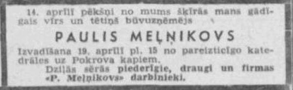 Pāvels (Pauls) Melņikovs pēkšņā nāvē miris 1944. gada 14. aprīlī. Nelaiķa izvadīšanas ceremonija notikusi Rīgas Kristus Piedzimšanas katedrālē, bet apbedīšana ceremonija — Rīgas Pokrova kapos.
