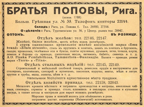 Tirdzniecības firma “Brāļi Popovi” tika nodibināta 1788. gadā Rīgā, tā nodarbojusies ar dzelzs un metālizstrādājumu vairumtirdzniecību.